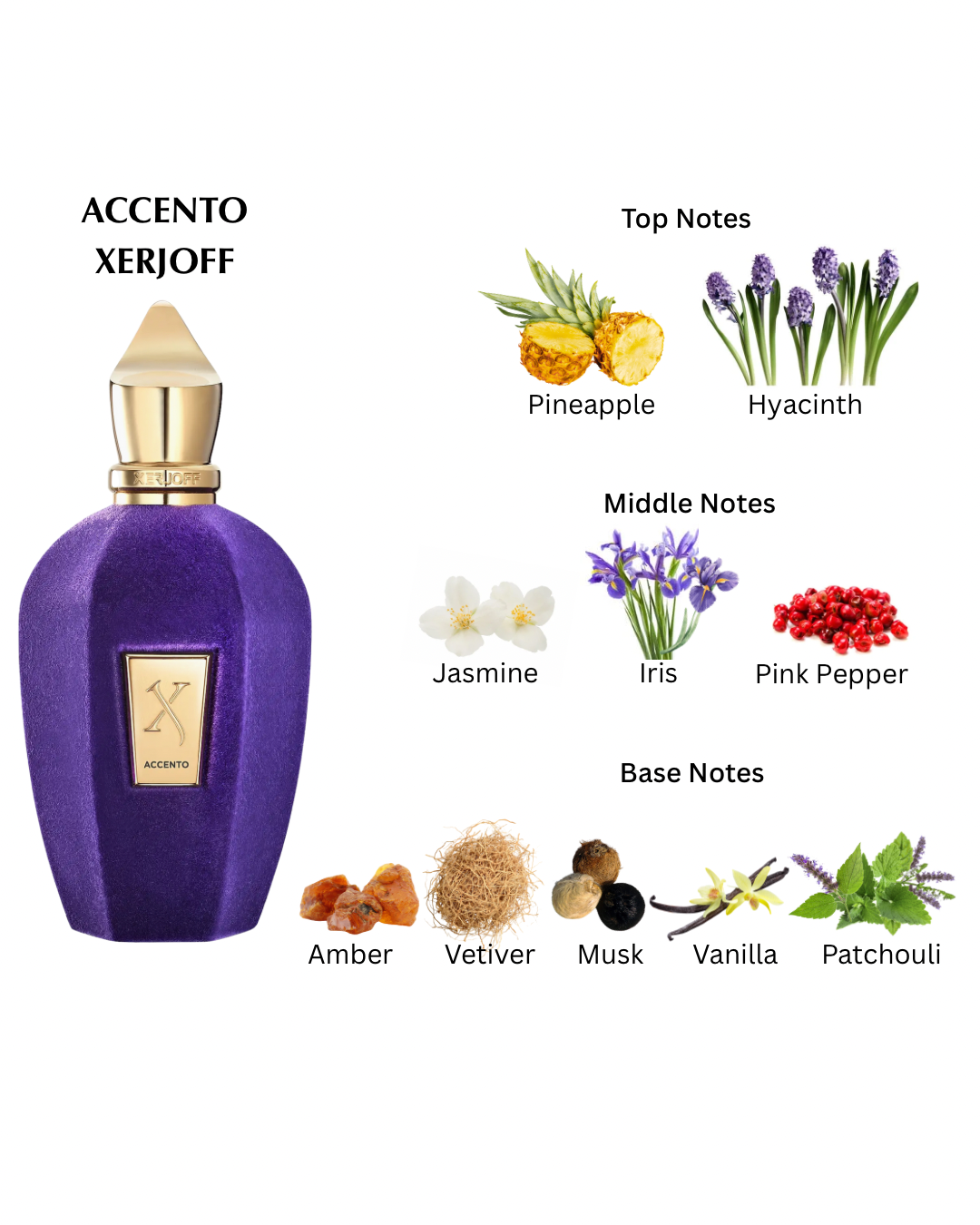 Indulge in the romance of Accento Xerjoff, a fruity scent with undeniably elegant flair. Opening with top notes of fresh pineapple and hyacinth, this refined parfum has a classic heart of jasmine, iris and pink pepper. A warm base of patchouli, amber and musk offers a classic undertone.