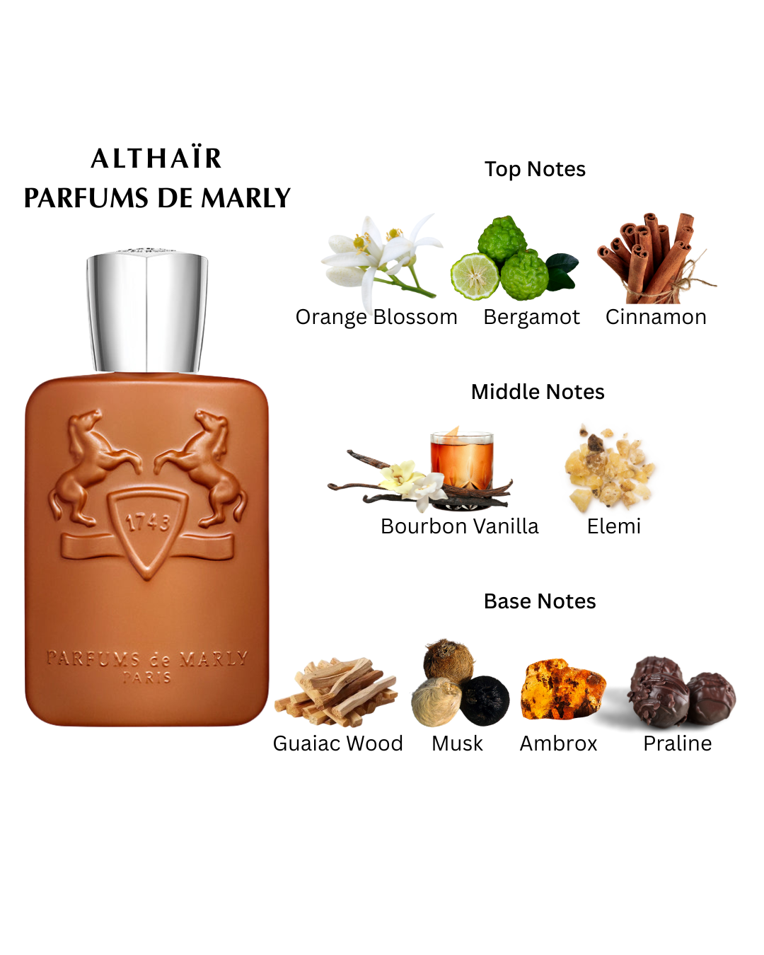 Althair by Parfums de Marly is a contemporary celebration of a classic perfumery ingredient: Bourbon vanilla, a direct descendant of that introduced to France during the reign of Louis XV. A woody, oriental, spicy composition that creates a luminous and powerful projection on the skin, with an elegant and generous tonka/musk accord and an overdose of vanilla.