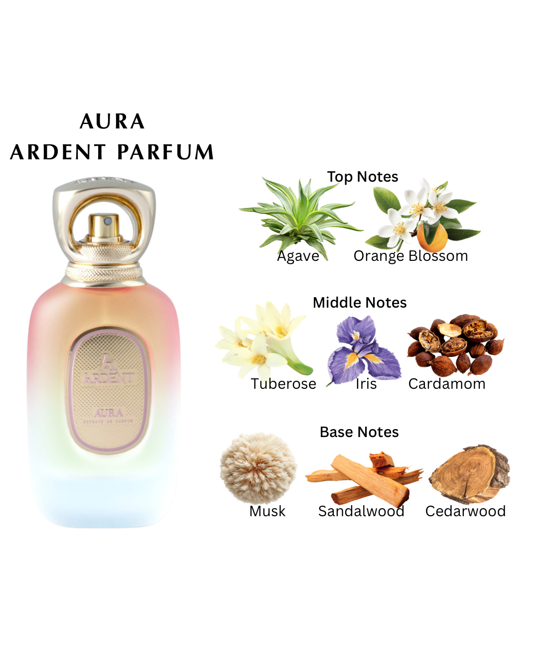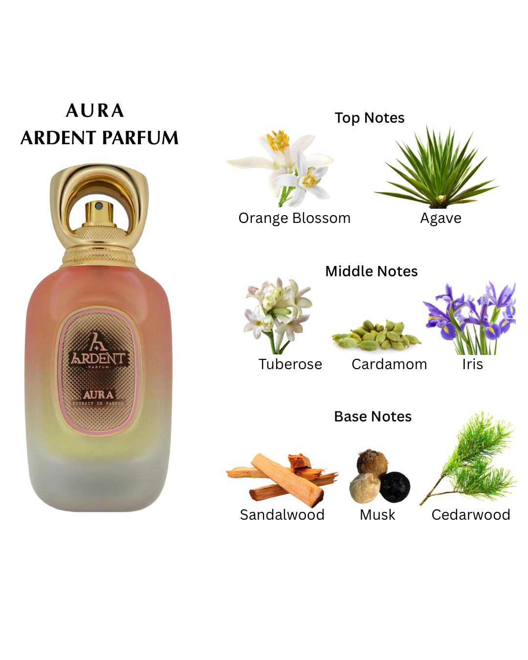 Aura is a fragrance that beautifully balances the softness of florals, the depth of woods, and the allure of musk. Its multi-layered and complex structure makes it ideal for those seeking a blend of delicacy and strength.
