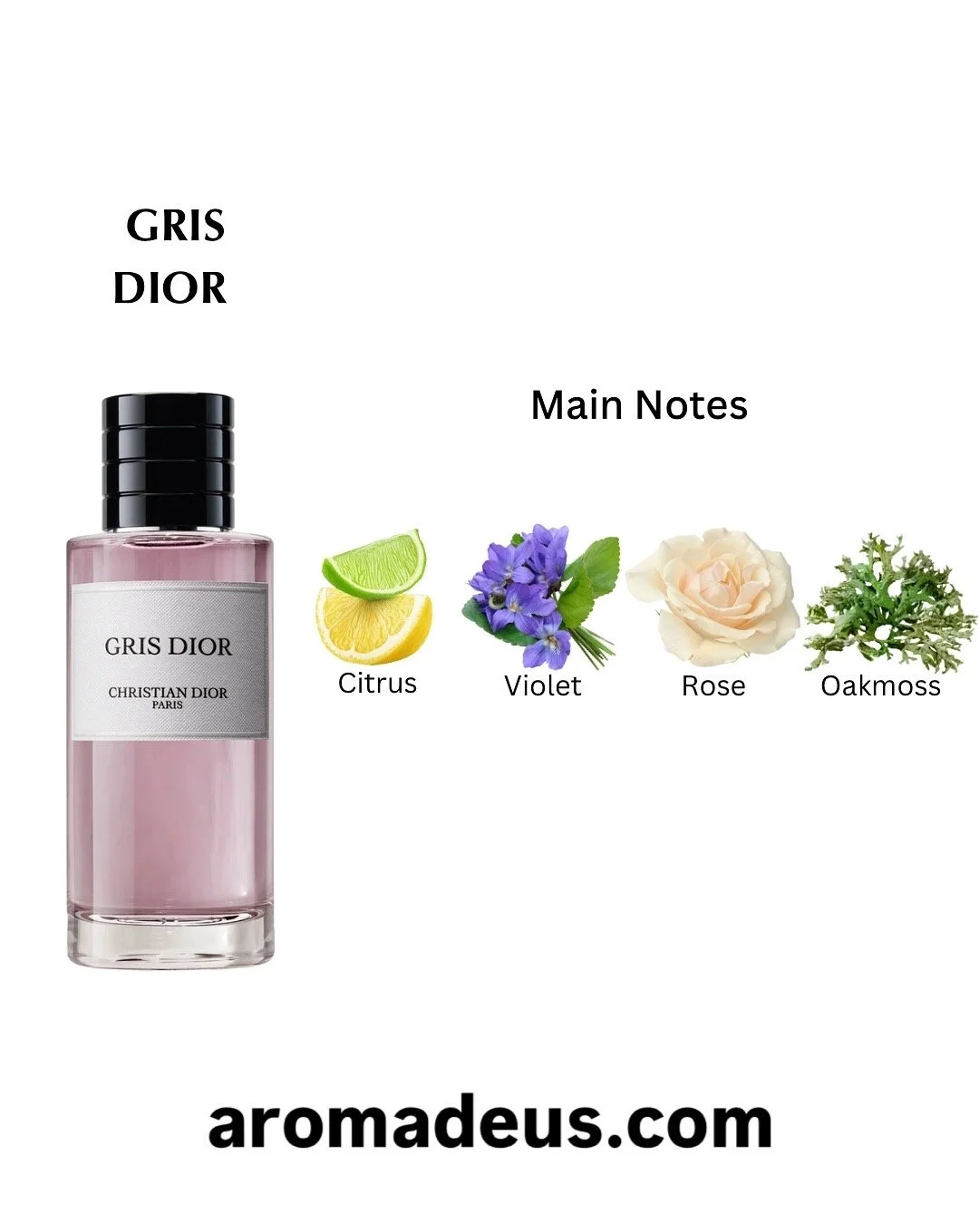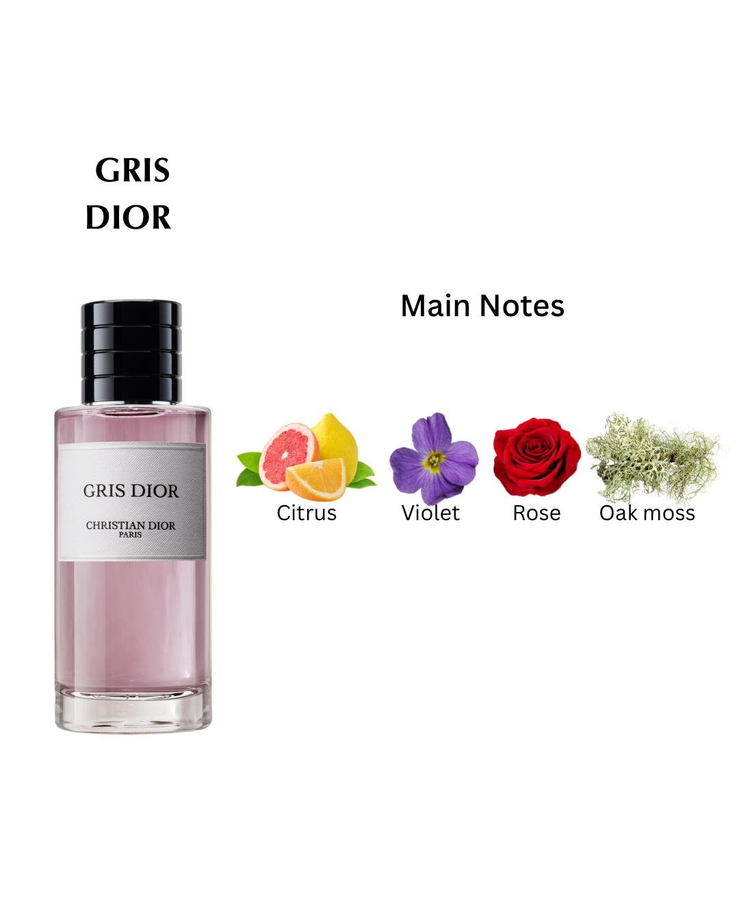 Gris Dior is a luxury perfume for women and men that unfolds its floral and woody facets to reveal the boldest nuances while exuding a sense of fullness and volume. This scent brings together multiple olfactory hues to create a mysterious chypre trail faceted by notes of citrus, rose, violet and oak moss.