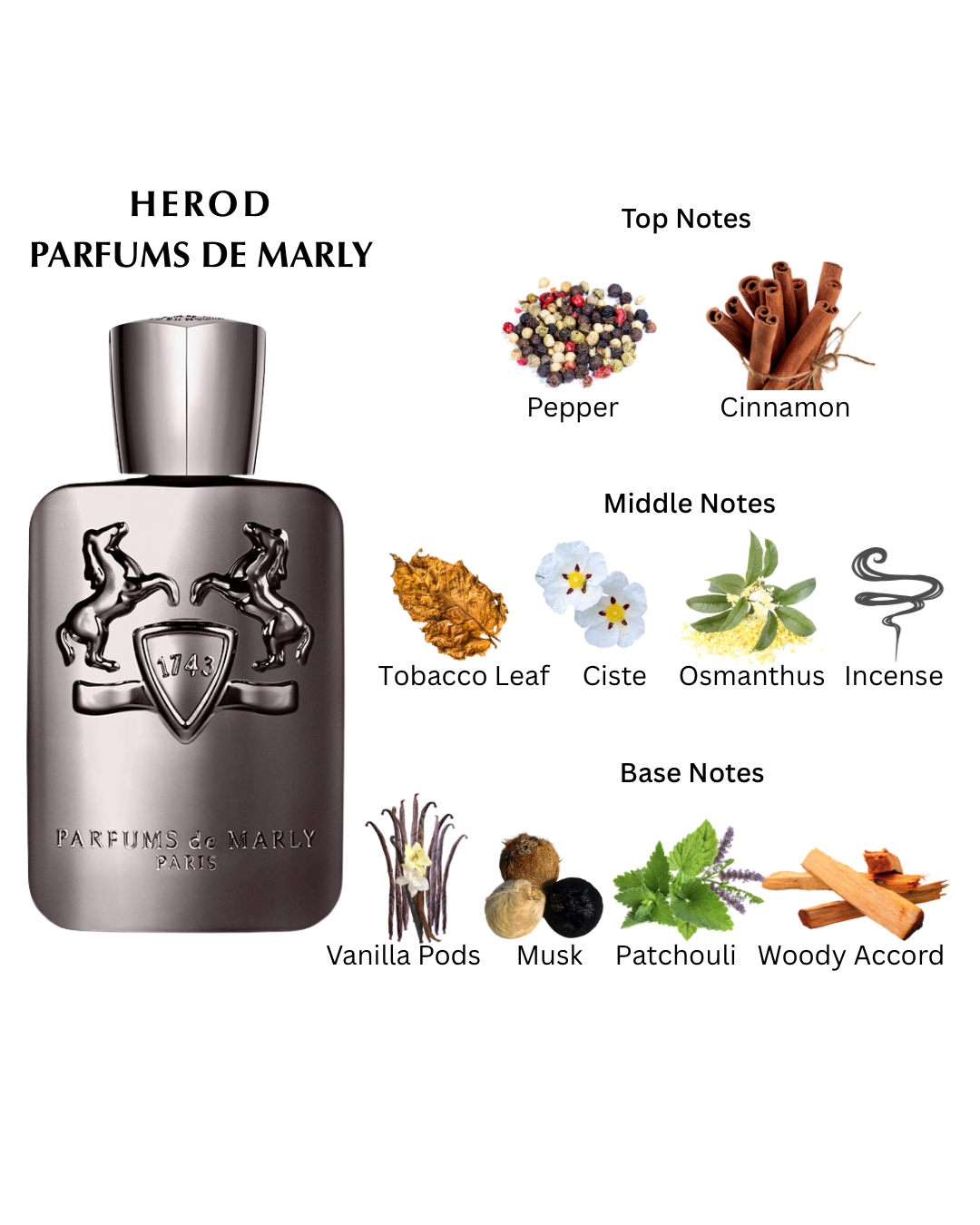 Herod was an English thoroughbred racehorse considered to be one of the four stallions of the 18th century that created the breed. Parfums de Marly was inspired by the stallion's majesty and created the Herod fragrance. A signature scent that embodies the sophistication of the era with its bold and sumptuous trail. This oriental, woody, spicy, releases notes of cinnamon in the top, twisted with notes of incense in the heart. The perfume is then crowned with notes of tobacco, vanilla, cedar and amber in the base that bring warmth and character.