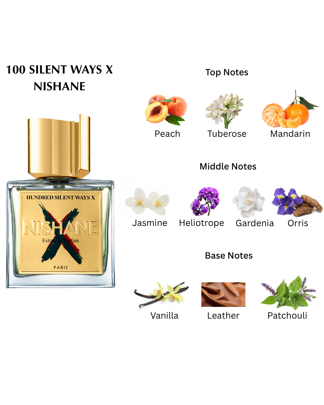 For Hundred Silent Ways X, Anne Flipo has created a fruity-leathery floral fragrance. The fragrance opens with a juicy explosion of tangerine and peach, leading to a heart of delicate gardenia. Base notes of vanilla, leather and patchouli give the fragrance a warm, sensual character.