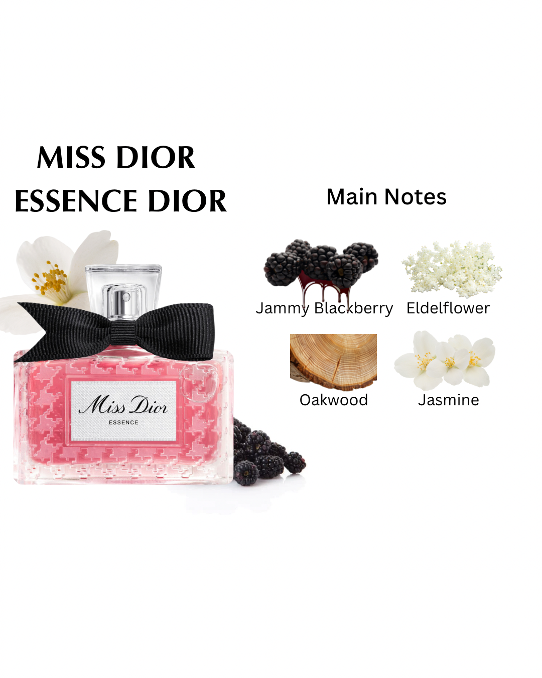 Miss Dior Essence is both surprising and captivating: a jammy blackberry and elderflower accord elevates a wildly luxurious jasmine bouquet.