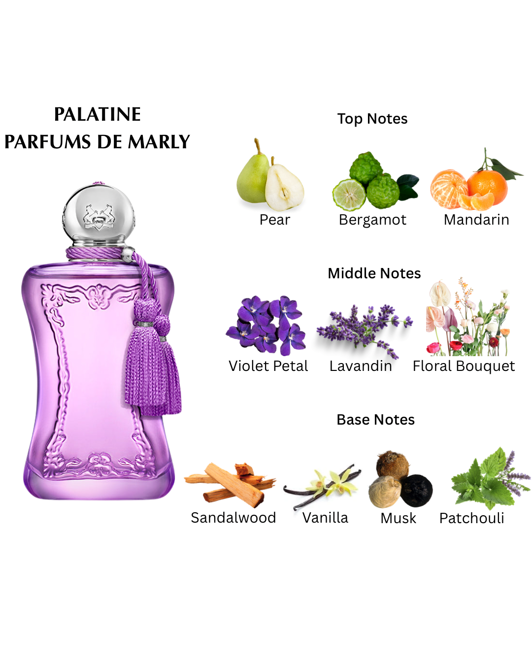 Palatine celebrates this bold and modern spirit by interpreting an iconic note: the violet petal. Both sophisticated and gourmand, delicate and radiant, this fragrance opens with a fruity head of sparkling bergamot and juicy peach. At the heart, tuberose intertwines with fresh and subtly powdery violet. Contrasting with the initial freshness, the creamy sweetness of vanilla combines with the woody warmth of sandalwood in the base, leaving a sensual and refined trail.