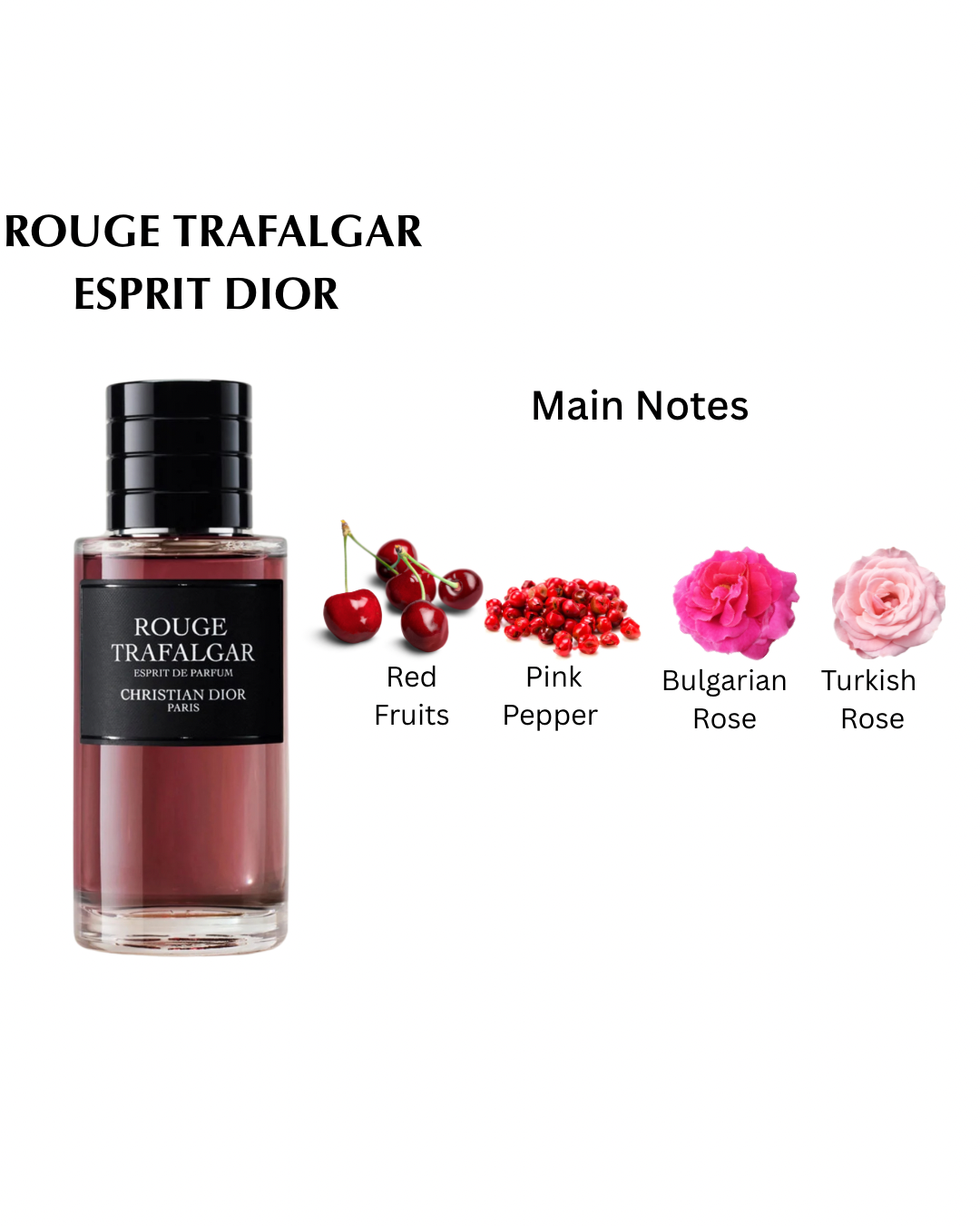 The soft, scarlet hue of Rouge Trafalgar luxury perfume becomes red, redder still, like a ripe, crisp cherry. Its Esprit de Parfum is made deeper and more incisive through a strong pink pepper note and more compelling by the essences of Turkish and Bulgarian roses. A Dior perfume for women and men with a trail of gourmand notes that evoke tempting, surprising and powerfully attractive red fruit.