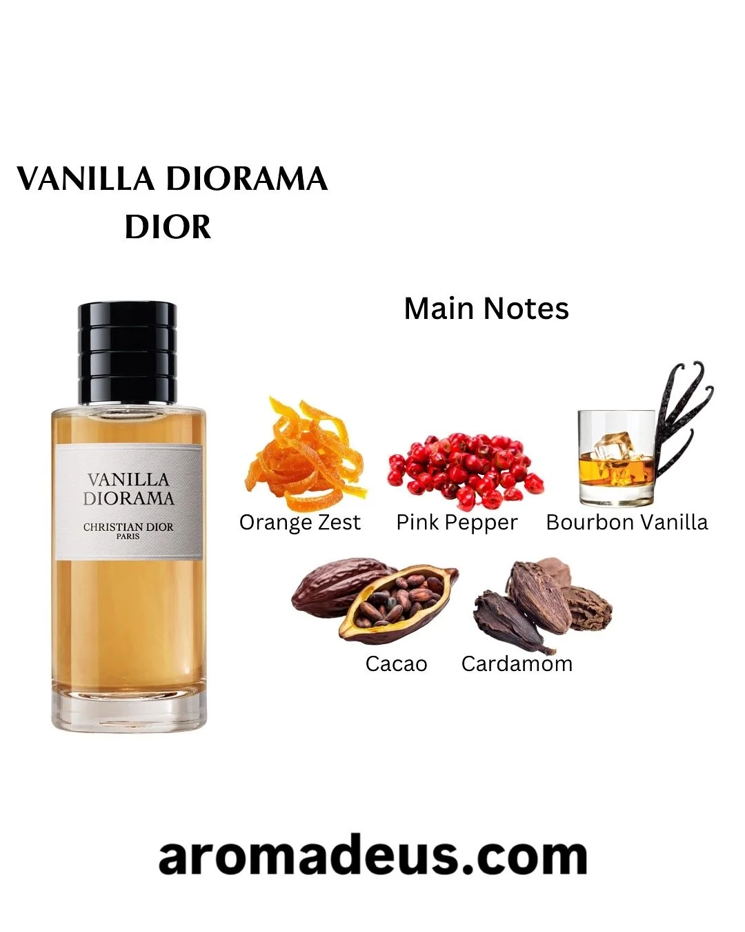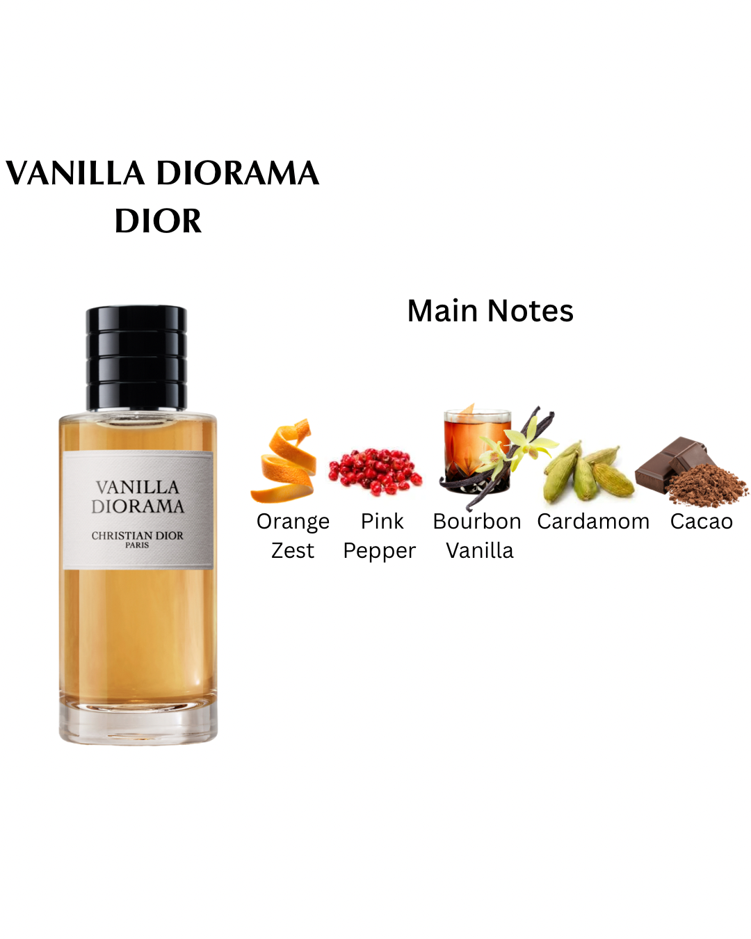 Known for his fine palate, Christian Dior was a true epicurean who was honored by the famous Parisian restaurant Maxim's, with a dessert created just for him: the Diorama Gourmand. Vanilla Diorama eau de parfum is a vanilla perfume that evokes the dessert's delightful lightness and contrasts, echoing the generous chiffon skirt of the “Diorama” silhouette drawn by the Couturier-Perfumer.